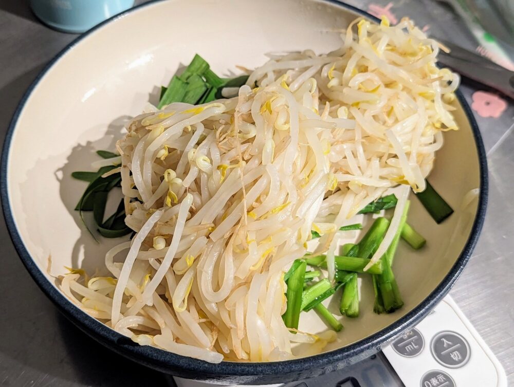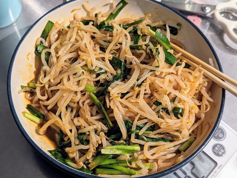 ・もやしが生の状態で混ぜようとしても、もやしがピンピンしているので、